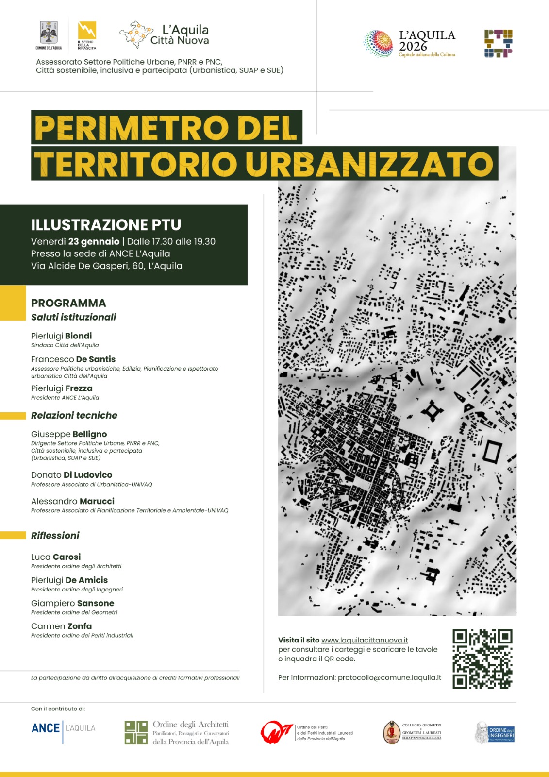 Durante l’evento interverranno gli uffici comunali, i responsabili dell’Università degli Studi dell’Aquila (UniVaq) e gli Ordini professionali, che illustreranno e discuteranno i criteri adottati e le visioni future alla base del nuovo piano regolatore, in un’ottica di confronto e condivisione.
