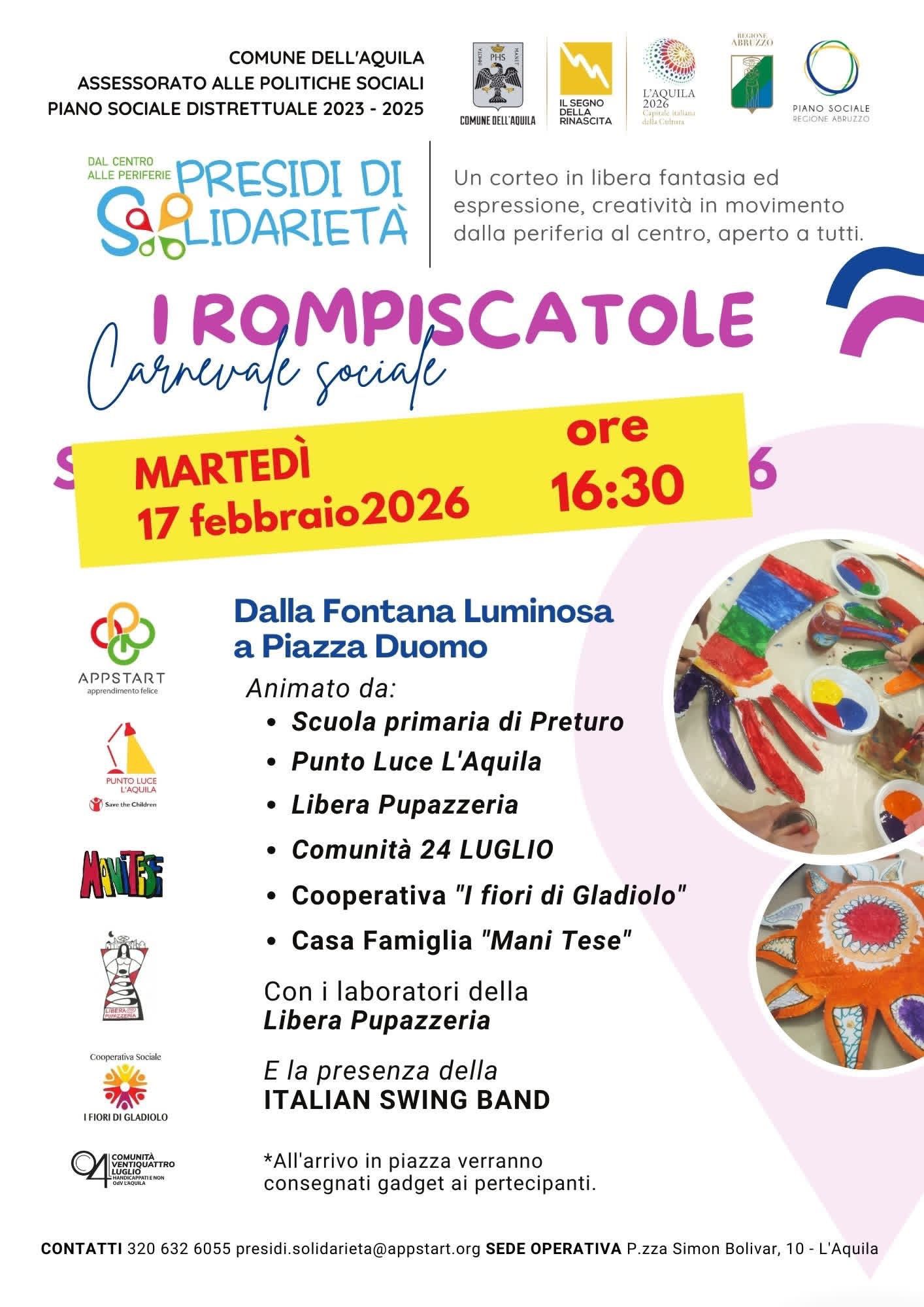 Un Carnevale che unisce, che attraversa i quartieri e mette al centro le famiglie. Martedi 17 febbraio, alle ore 16:30, prenderà il via dalla Fontana Luminosa il corteo del “Carnevale sociale”, un grande momento di festa e partecipazione che arriverà fino a Piazza Duomo, trasformando il cuore della città in uno spazio di creatività, inclusione e condivisione. L’iniziativa rientra nel progetto dell’Assessorato alle Politiche sociali del Comune dell’Aquila “Presidi di Solidarietà” e coinvolge scuole, associazioni, cooperative sociali e realtà educative del territorio. L’Amministrazione conferma così la propria attenzione verso l’infanzia, l’adolescenza e il sostegno alla genitorialità, investendo su iniziative che promuovono coesione sociale e inclusione.