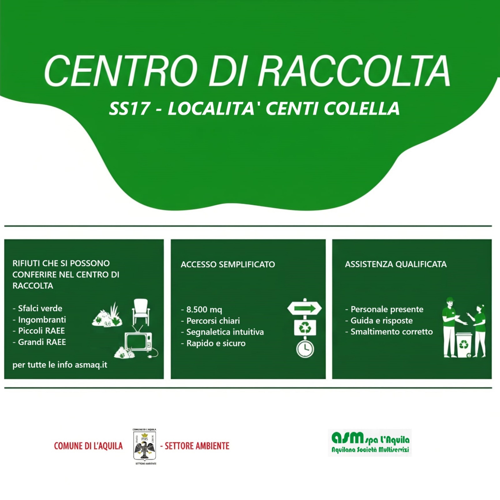 Realizzato dal settore Ambiente del Comune dell’Aquila, insieme ad ASM S.p.A., l’infrastruttura si estende su una superficie complessiva di oltre 8.500 metri quadrati. Si tratta di una struttura moderna, organizzata e progettata per facilitare il conferimento dei rifiuti da parte dei cittadini, consentendo di avviare a recupero o smaltimento un’ampia gamma di rifiuti, dagli sfalci verdi ai materiali ingombranti, fino ai piccoli e grandi RAEE, ossia le apparecchiature elettriche ed elettroniche.