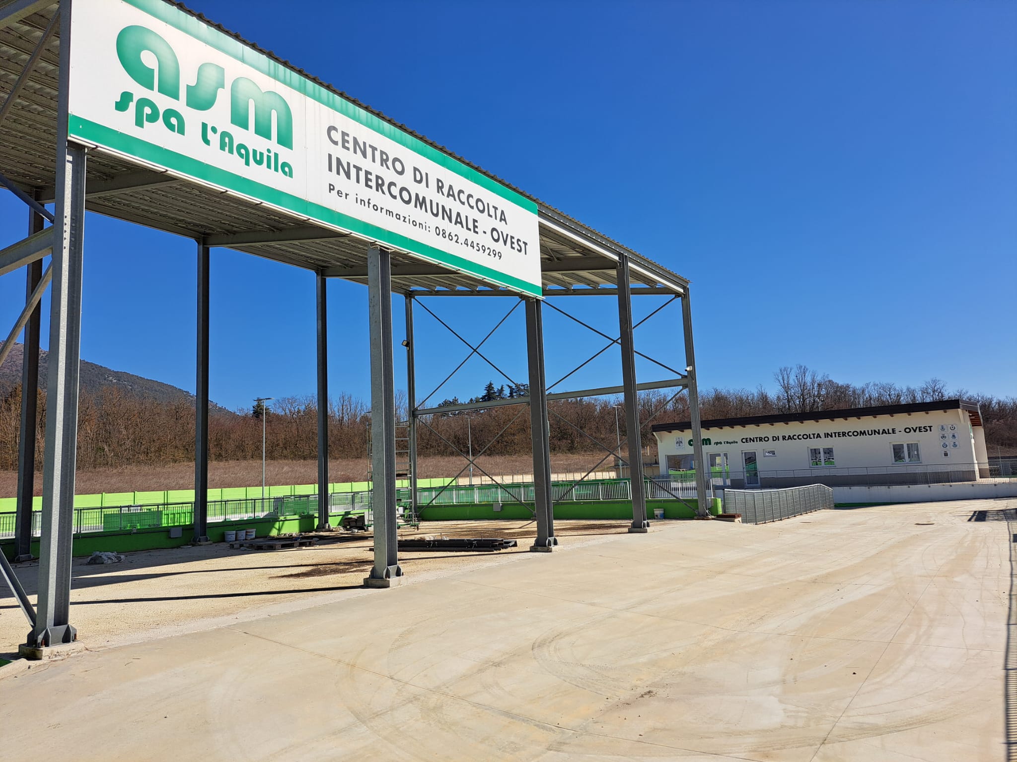 Il centro di raccolta dell’Aquila Ovest è stato realizzato ex novo nell’ambito degli interventi finanziati attraverso il Fondo per lo Sviluppo e la Coesione (FSC) 2007–2013, per un investimento complessivo di oltre 785mila euro, di cui 550mila a carico della Regione Abruzzo. L’attivazione della struttura è stata preceduta dal completamento delle opere di raccordo con la viabilità esistente lungo la SS17, per le quali è stato acquisito il nulla osta di ANAS all’apertura di un accesso provvisorio al centro, con specifiche prescrizioni in materia di sicurezza della circolazione, tra cui il divieto di effettuare manovre sia in ingresso che in uscita dall’area.