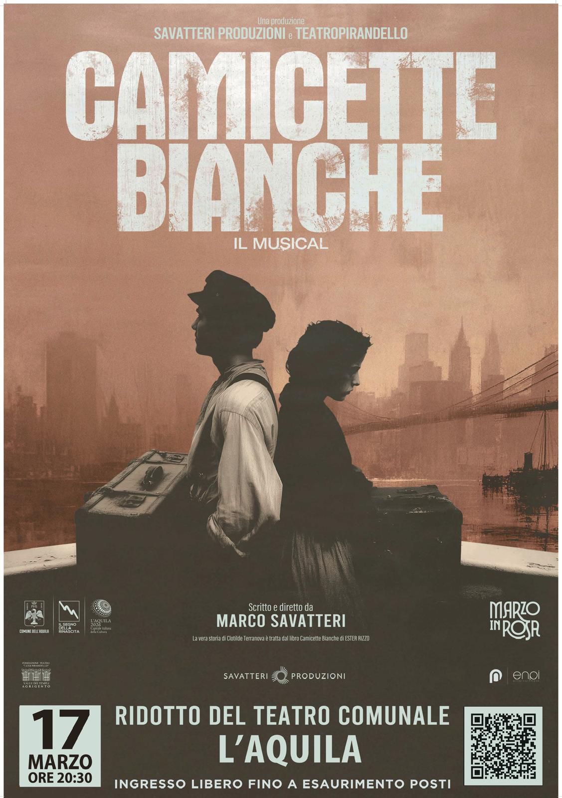 Uno spettacolo intenso e di grande valore civile per raccontare una pagina drammatica della storia del lavoro femminile. È “Camicette Bianche – Il musical”, in programma martedì 17 marzo alle ore 20.30 al Ridotto del Teatro Comunale dell’Aquila, inserito nel calendario di “Marzo in Rosa”, il programma di iniziative promosso dall’amministrazione comunale per la Giornata internazionale della donna.