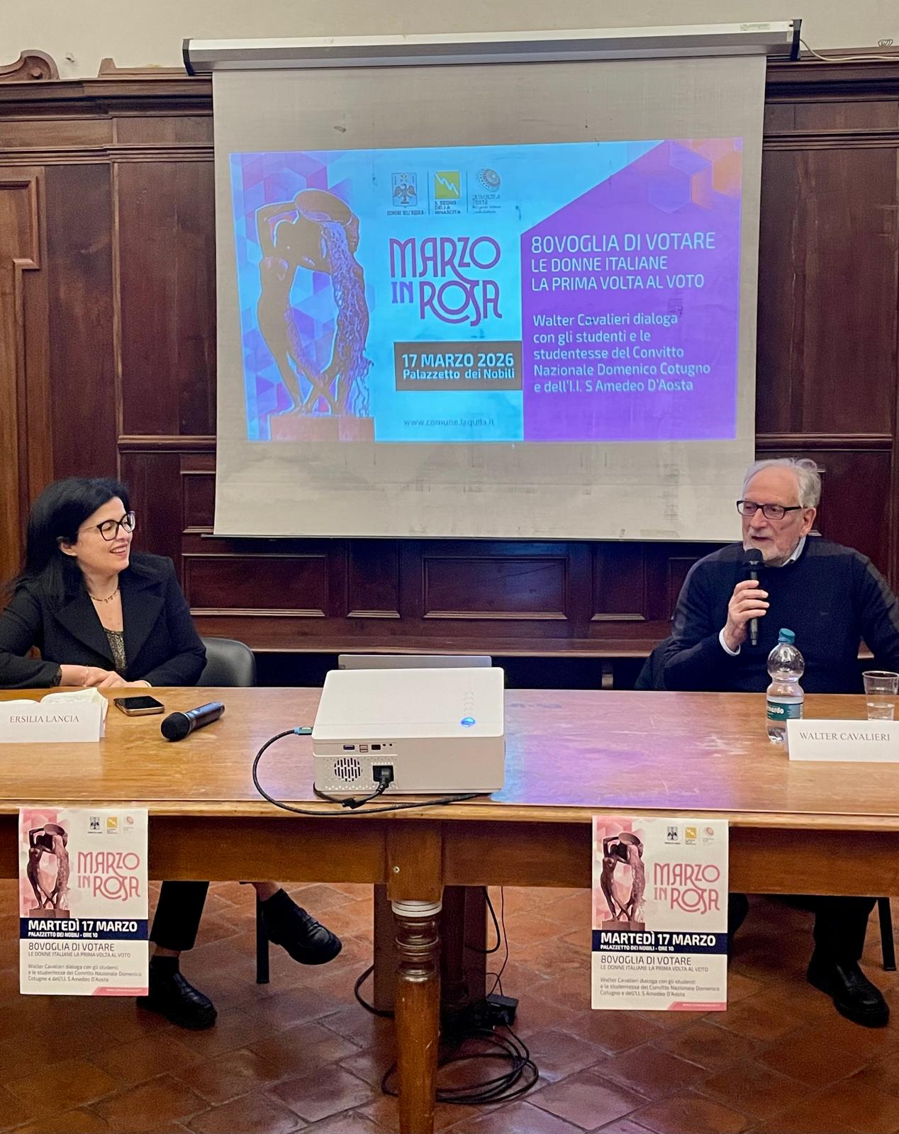 In occasione dell’ottantesimo anniversario di quello avvenimento epocale, nell’ambito delle iniziative promosse dal Comune dell’Aquila per la 4^ edizione di “Marzo in Rosa”, questa mattina presso il Palazzetto dei Nobili si è svolto un interessante dibattito denominato “80 voglia di votare – Le donne italiane la prima volta al voto”, presieduto dall’Assessore alle Pari Opportunità Ersilia Lancia, durante il quale lo storico e filosofo Walter Cavalieri ha incontrato gli studenti e le studentesse del Convitto Nazionale “Domenico Cotugno” e dell’Istituto d’Istruzione Superiore “Amedeo d’Aosta”.