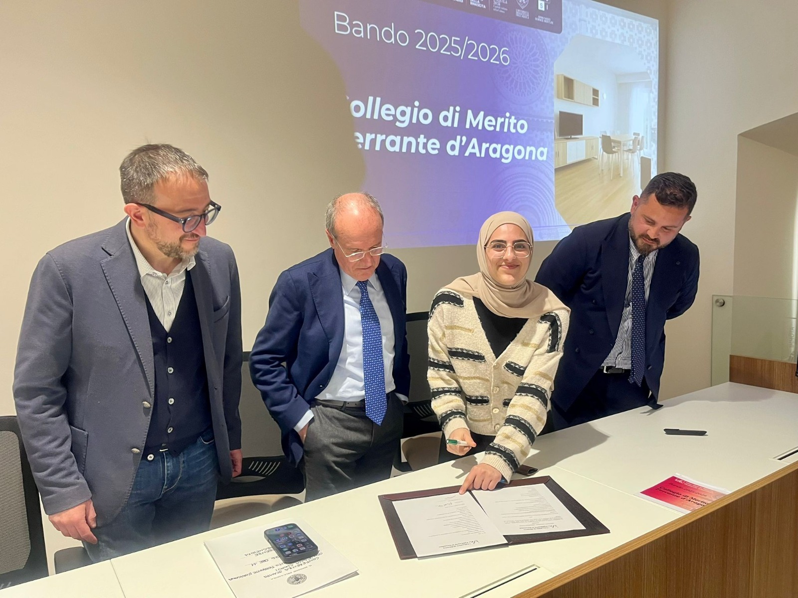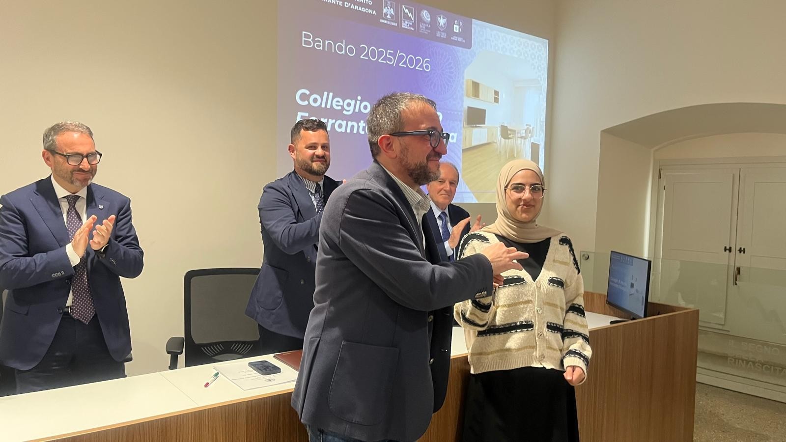 La conferenza stampa si è conclusa con due momenti simbolici, la consegna delle chiavi di un appartamento da parte del sindaco Biondi alla studentessa palestinese Sadeen Raed Atta Jawabreh, e la firma del contratto da parte del presidente De Berardinis e della ragazza stessa.