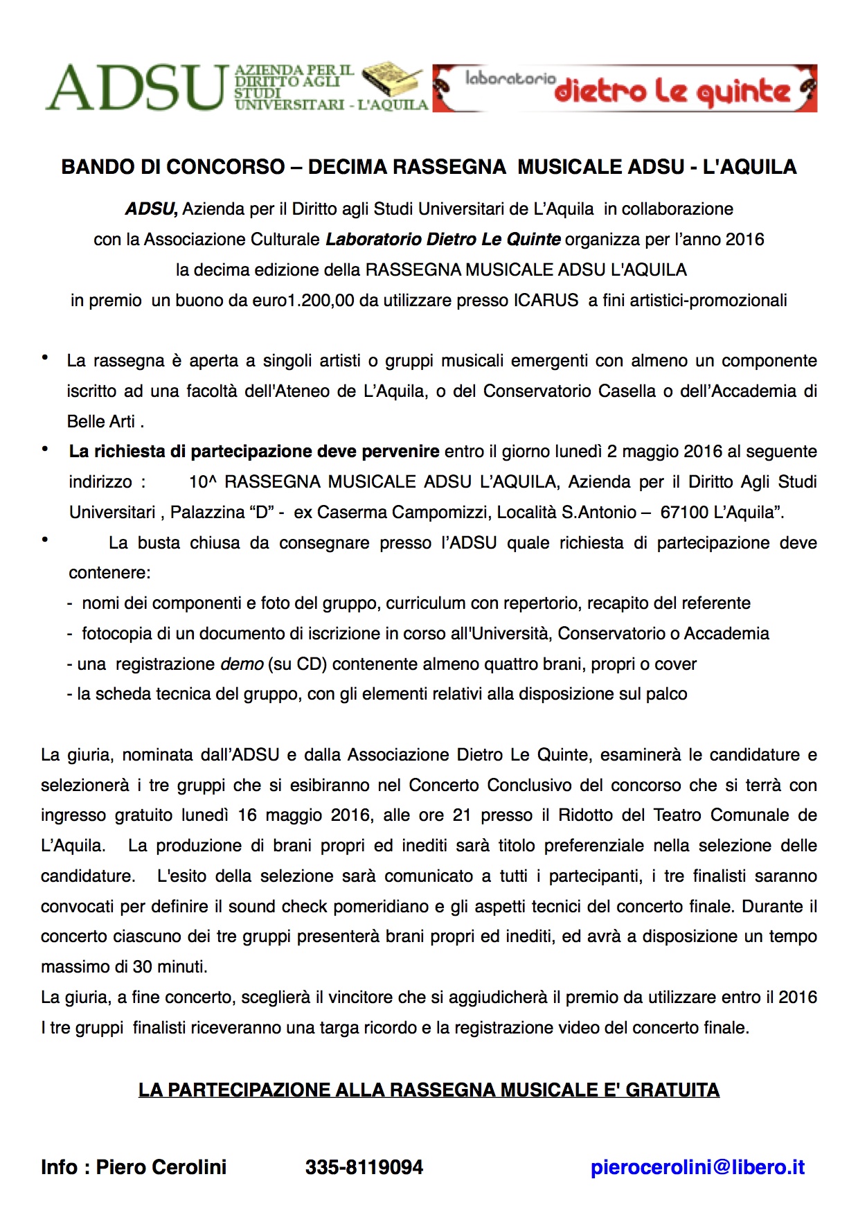 Scade il 2 maggio il bando di concorso per la decima rassegna musicale dell'Azienda per il Diritto alla Studio (ADSU), L'Aquila. La rassegna, organizzata in collaborazione con l'associazione culturale "Laboratorio dietro le quinte", è aperta a singoli artisti o gruppi musicali, con almeno un componente iscrito alla facoltà dell'Ateneo aquilano o al Conservatorio "A. Casella" o all'Accademia di Belle Arti.