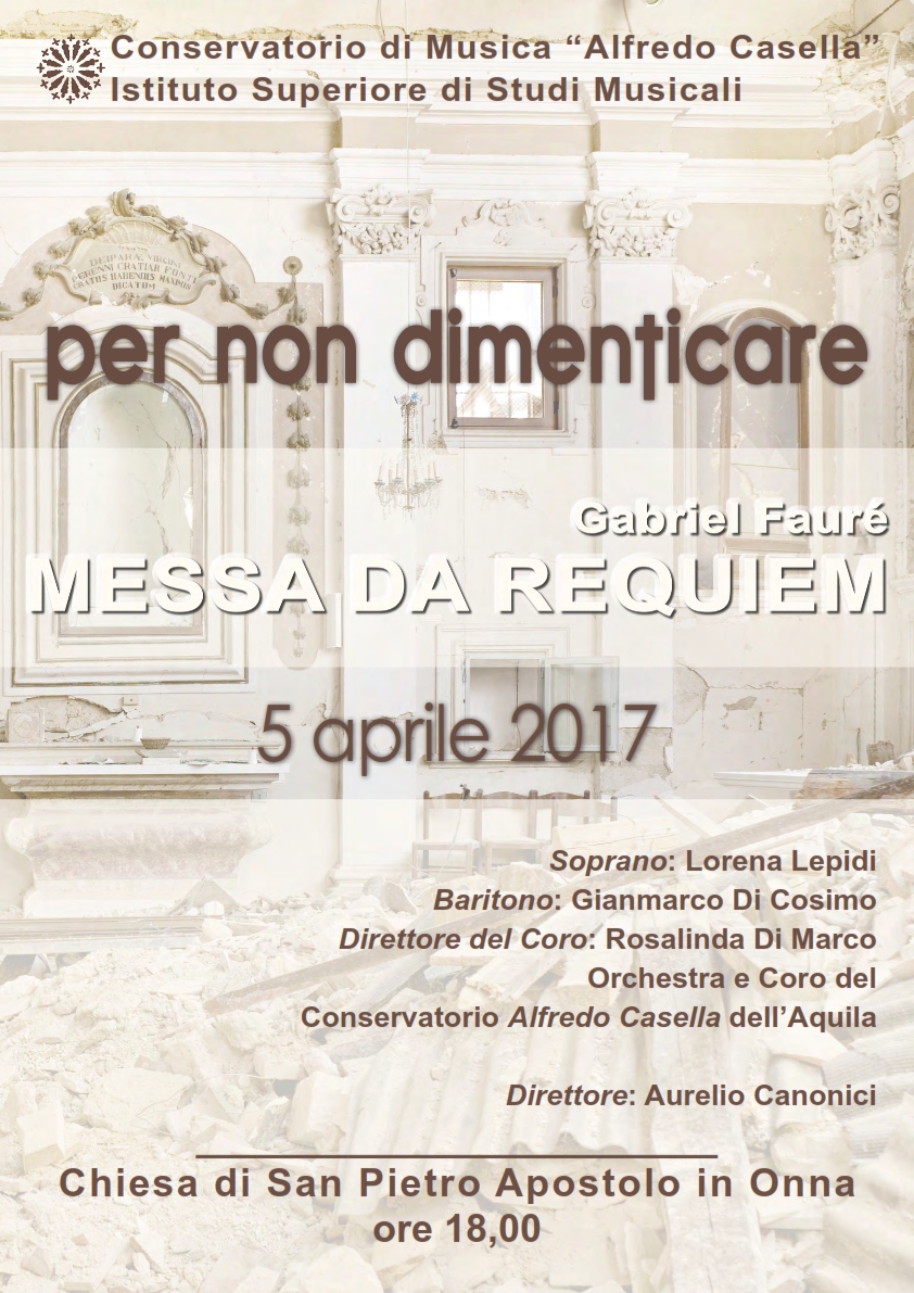 Ad Onna il 5 aprile si terrà la Messa da requiem "Per non dimenticare", a cura del Conservatorio dell'Aquila "A. Casella" presso la Chiesa di San Pietro Apostolo alle ore 18.00; mentre il 6 aprile si terrà il concerto commemorativo "La natura della Musica", duo Arneis in concerto alle ore 17.30 presso la Chiesa di San Pietro Apostolo (Il programma delle iniziative a Onna)