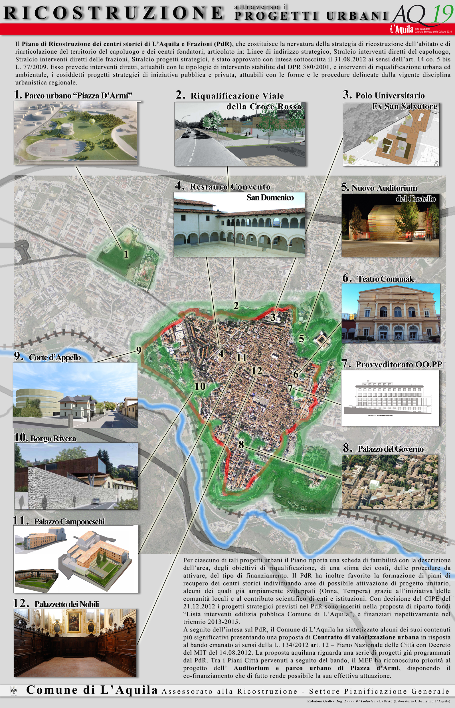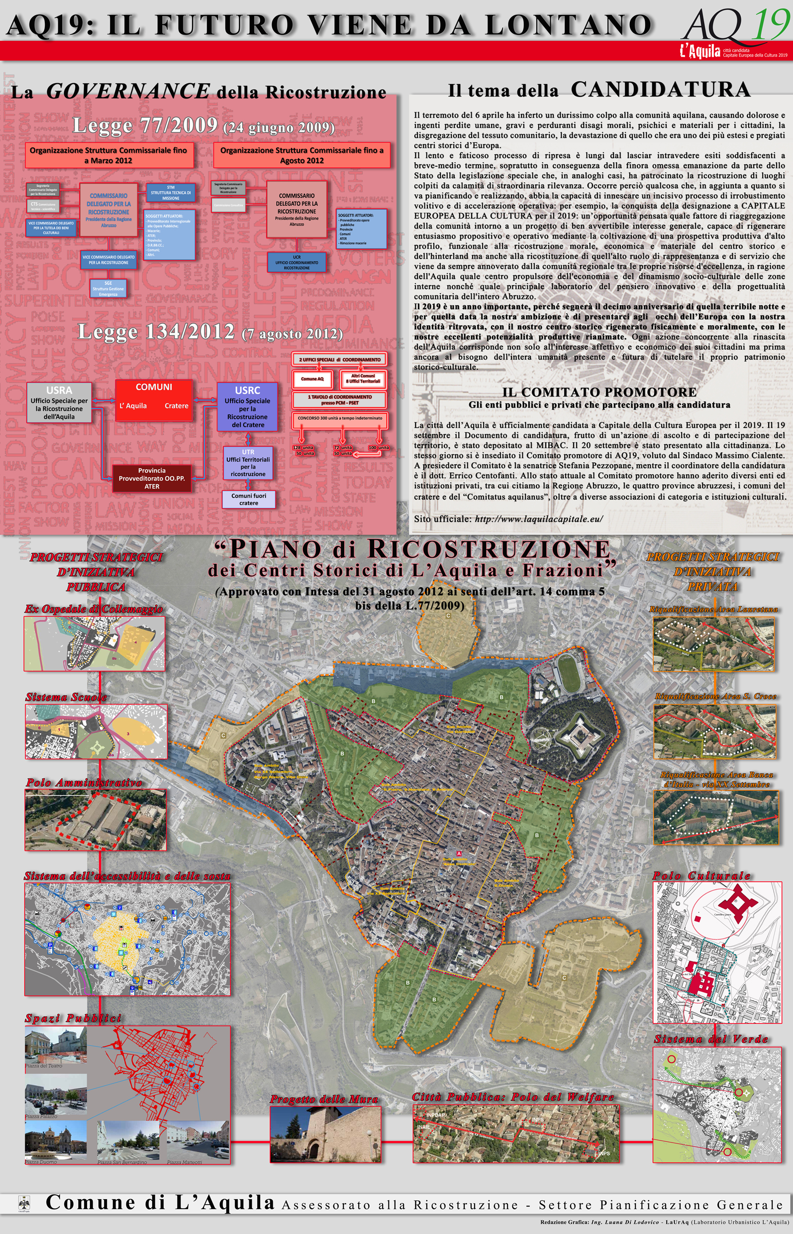 Il Comune di L'Aquila ha partecipato, in qualità di Città candidata a CAPITALE EUROPEA DELLA CULTURA per il 2019, all'UrbanPromo 2013, organizzato dall' INU e da URBIT e svoltosi a Torino nelle date dal 6 all'8 novembre 2013. Di seguito i materiali presentati nella rassegna urbanistica articolati su due principali argomenti: la Candidatura a Capitale Europea per il 2019 e la Governance della Ricostruzione post sisma.
