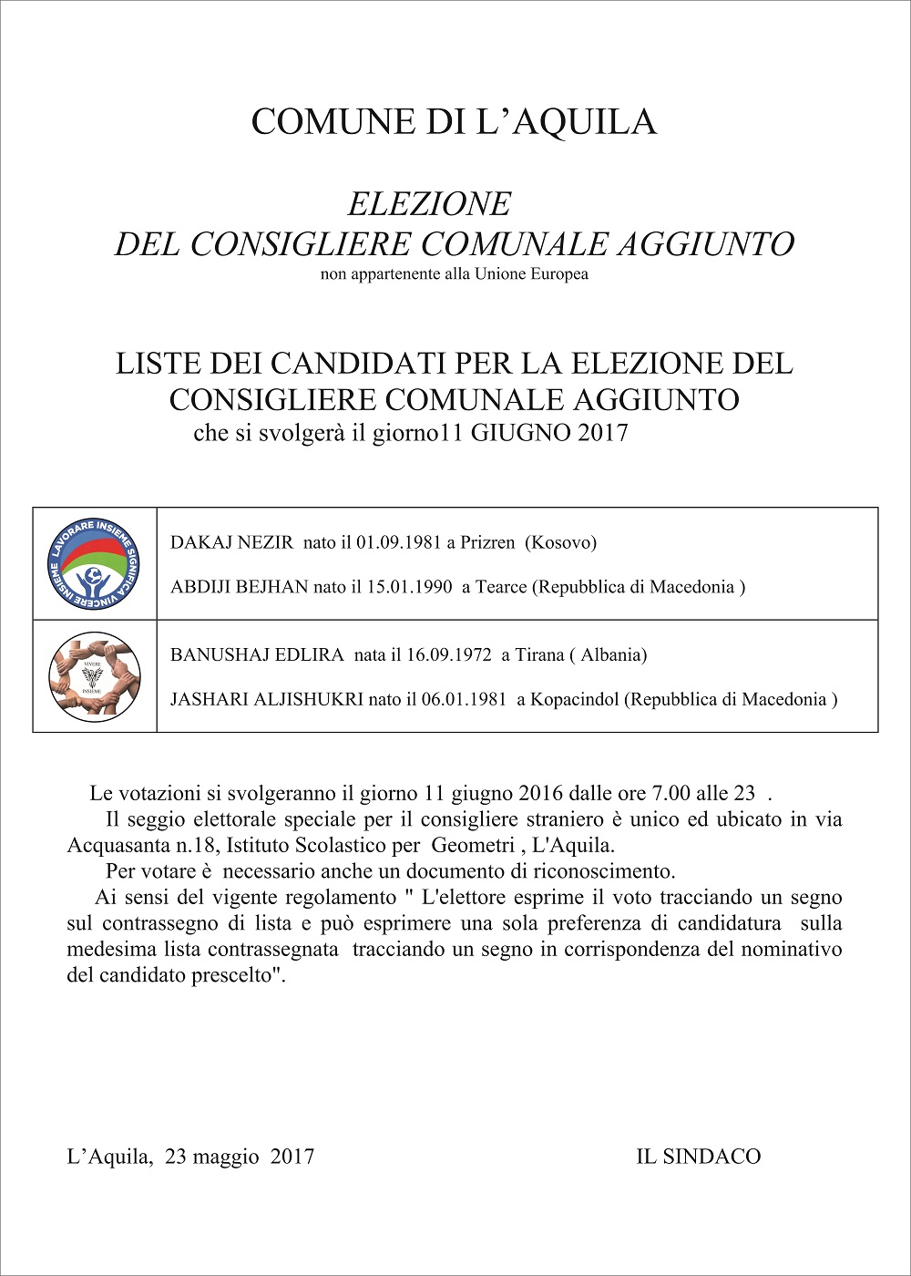 L'11 giugno 2017 si vota anche per l'elezione del Consigliere straniero aggiunto, vale a dire il rappresentante dei cittadini stranieri non appartenenti all'Unione Europea, che siano legalmente presenti in Italia e residenti nel Comune dell'Aquila. Il Consigliere straniero - figura prevista dall'articolo 21 dello Statuto comunale - siederà in Aula insieme agli altri 32 candidati che saranno eletti a giugno, con le possibilità e le prerogative contenute nel Regolamento. Cliccando sul primo link qui sotto, invece, è possibile scaricare il manifesto contenente i nomi delle liste e dei candidati, nonché il seggio in cui dovranno recarsi i cittadini non comunitari che hanno i requisiti per votare. Gli altri due link contengono invece i contrassegni delle due liste che partecipano alla consultazione. Il seggio per votare per il Consigliere Straniero sarà allestito all'Istituto Tecnico per Geometri, in via Acquasanta n. 18.