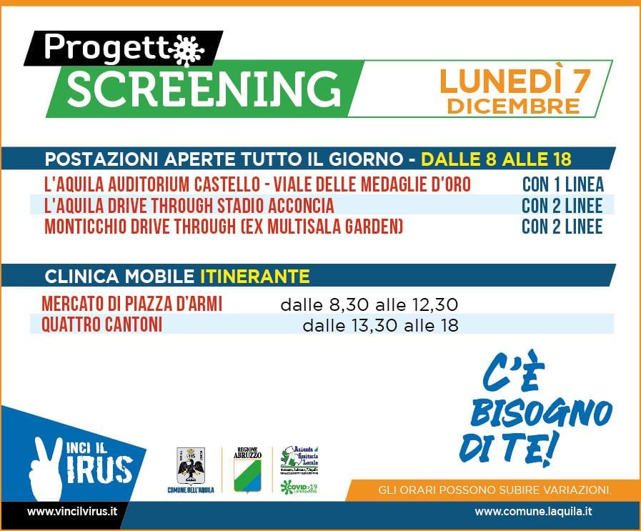 Nei giorni 3, 4, 5 e 6 dicembre la popolazione del comune dell'Aquila sarà interessata dal progetto screening di massa, promosso dalla Regione Abruzzo e per la cui organizzazione il Comune è impegnato in prima linea. Attraverso dei test rapidi, GRATUITI, si potrà conoscere in poco tempo se si è positivi o meno al coronavirus covid-19. In caso di necessità, il servizio sarà esteso al 7 dicembre. I punti di prelievo sono diffusi su tutto il territorio comunale e, per ragioni organizzative, la loro dislocazione e gli orari in cui gli stessi sono attivi saranno resi noti giorno per giorno. Per il 3 dicembre, scarica il file delle postazioni operative riportato qui sotto, tenendo presente che i percorsi veloci in auto (drive through) sono riservati ai disabili, agli ultraottantenni, alle donne in gravidanza e a coloro che sono affetti da patologie gravi. Per abbreviare i tempi di prelievo alle postazioni, è consigliabile presentarsi con il modulo di consenso informato già compilato e informato, modulo che può essere compilato on line o scaricato dai link qui sotto. I moduli sono anche disponibili presso le farmacie, le edicole, l'Infopoint situato a piazza Battaglione degli Alpini, il terminal di Collemaggio e alcune tabaccherie (qui l'elenco )Per saperne di più, vai su www.vincilvirus.it, il sito dell'unità di crisi del Comune dell'Aquila, a questa pagina